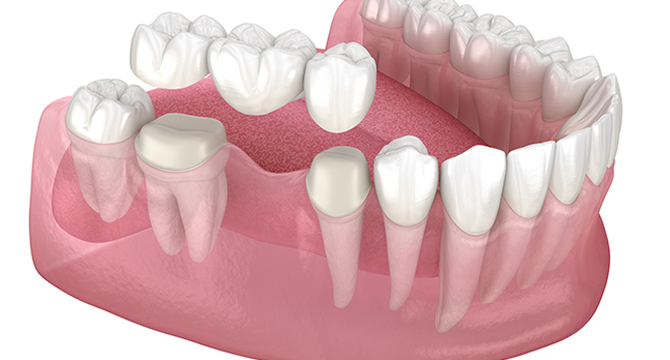 For patients who are missing multiple teeth, a bridge may be the ideal answer. Generally, a bridge fills the space created by one or more missing teeth. It is made up of two more more crowns – one on each side of the missing tooth. The anchoring teeth are called abutments, and the false tooth/teeth replacing the missing space is called the pontic. It is important to remember that it’s a permanent restorative dentistry solution. It’s not something that you remove in the evening.