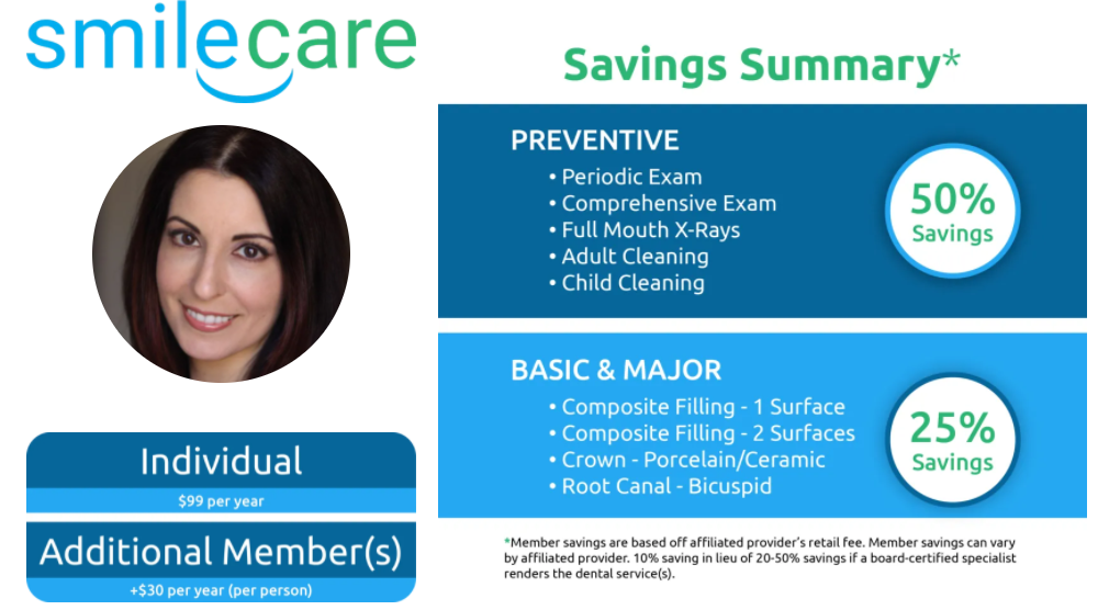Smile Care Savings Plan is NOT INSURANCE, but rather a licensed Dental Savings Plan offered through your local dentist office. The plan is not a qualified health plan under the Affordable Health Act. The plan does not make payments directly to affiliated providers. Active plan members receive pre-negotiated, transparent discounts from their affiliated provider’s retail fees applicable to patients without insurance. Since there is no paperwork or reimbursement, plan members must arrange payment with their affiliated provider at the time of service but will receive member-only discounts for all dental procedures rendered. The list of affiliated providers is on the plan website. Please check with your affiliated provider prior to beginning treatment. Discount Medical Plan Organization (DMPO) and plan administrator: Ascension Dental Partners LLC, 816 Congress Ave, Ste. 1620, Austin, TX 78701.